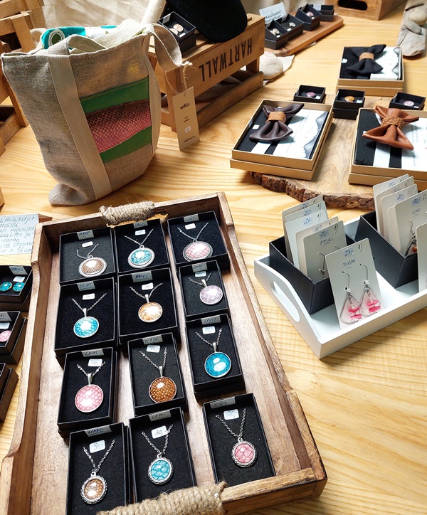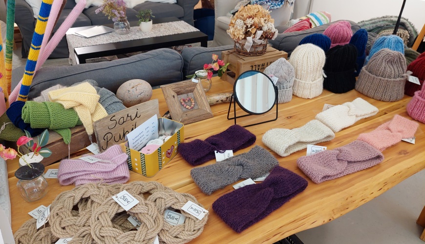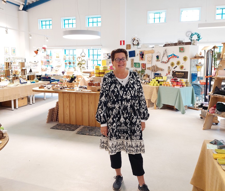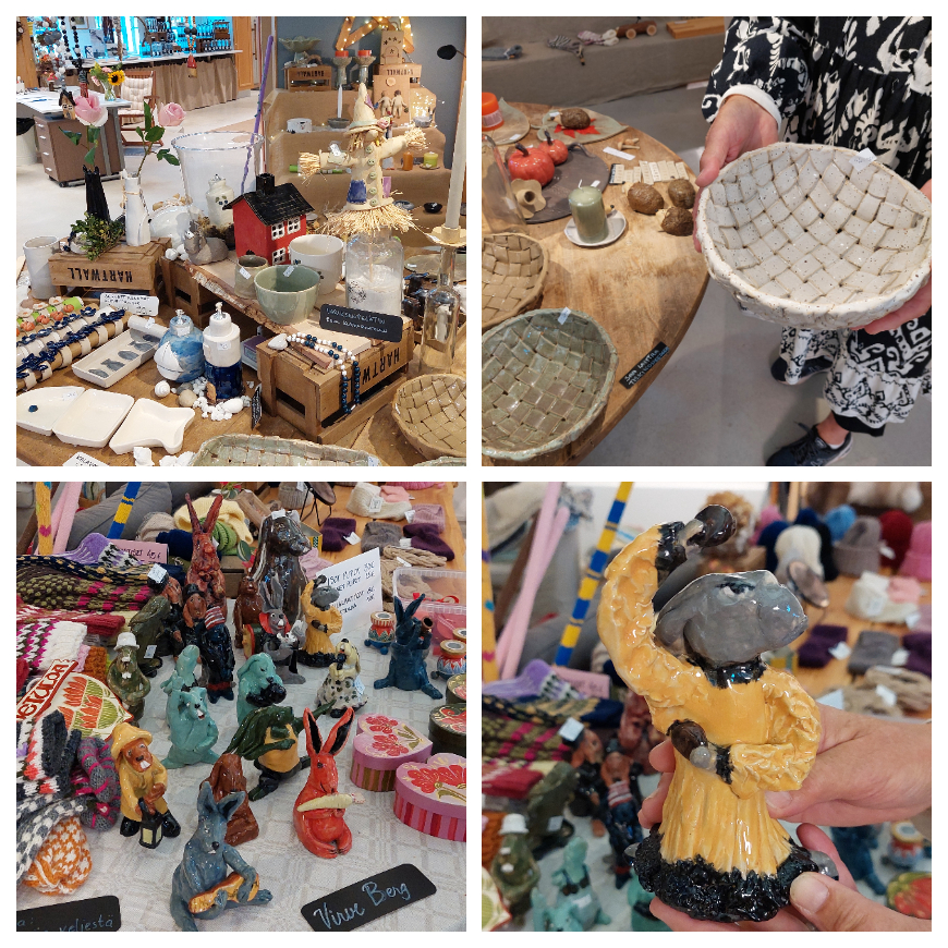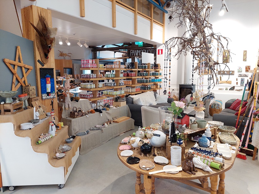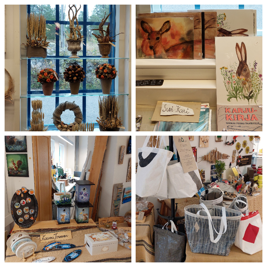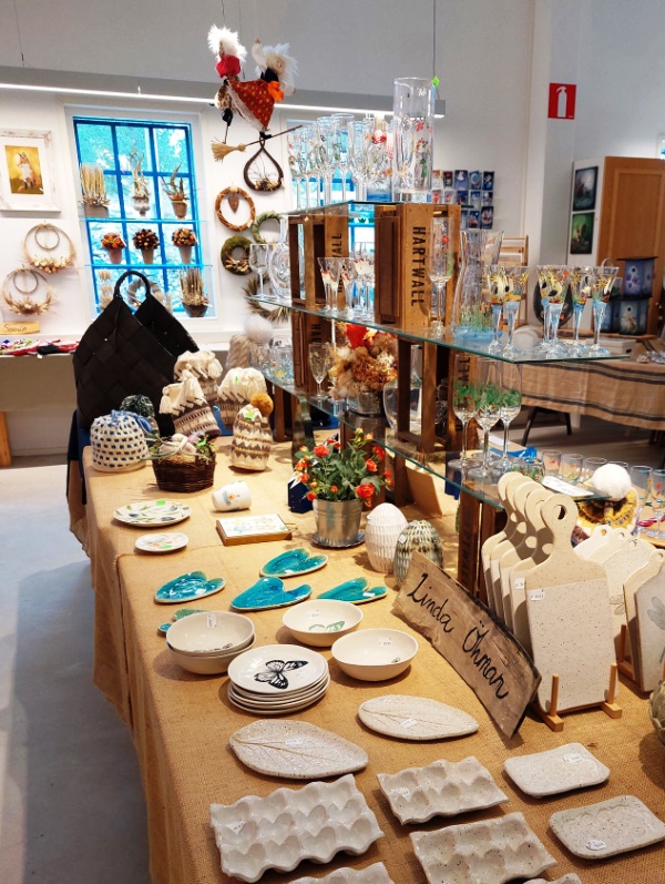 Näyttelyssä on kaikkiaan 40-50 eri käsityöläisen tuotteita. Ia kertoo, että tuotteiden pitää olla itse tehtyjä ja he eivät ota näyttelyyn mitä tahansa tuotteita. Ehkäpä siksi myymälä pysyy erottuvana – ja kotimainen käsillä tekeminen arvossaan!