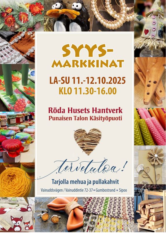 🔸 SYYSMARKKINAT LA-SU 11.-12.10.2025 klo 11.30-16.00. Tule tapaamaan käsityöläisiä paikan päälle. Saat ainutlaatuisen katsauksen heidän luovaan prosessiinsa ja voit nauttia heidän upeista teoksistaan.