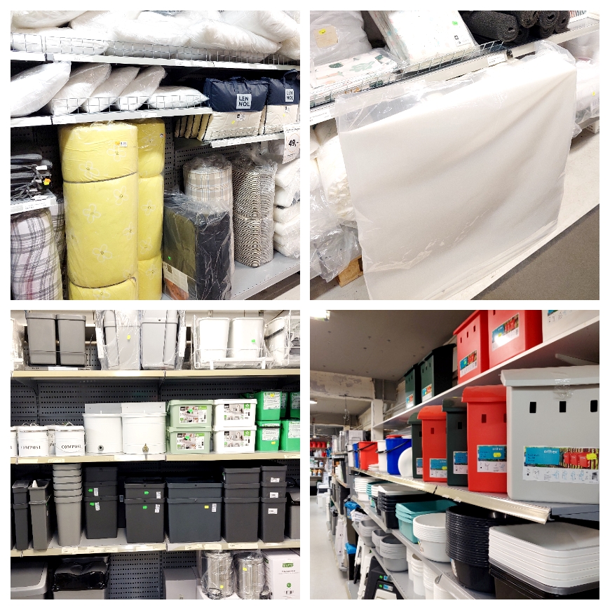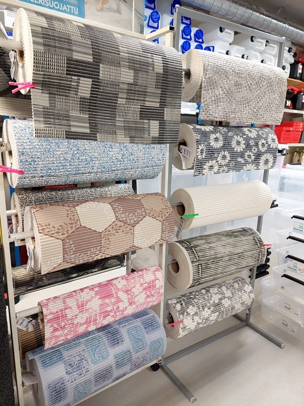 Edelleen laajassa myymälässä on muovisia ritilämattoja, jotka sopivat niin kylpyhuoneeseen kuin vaikkapa parvekkeelle.