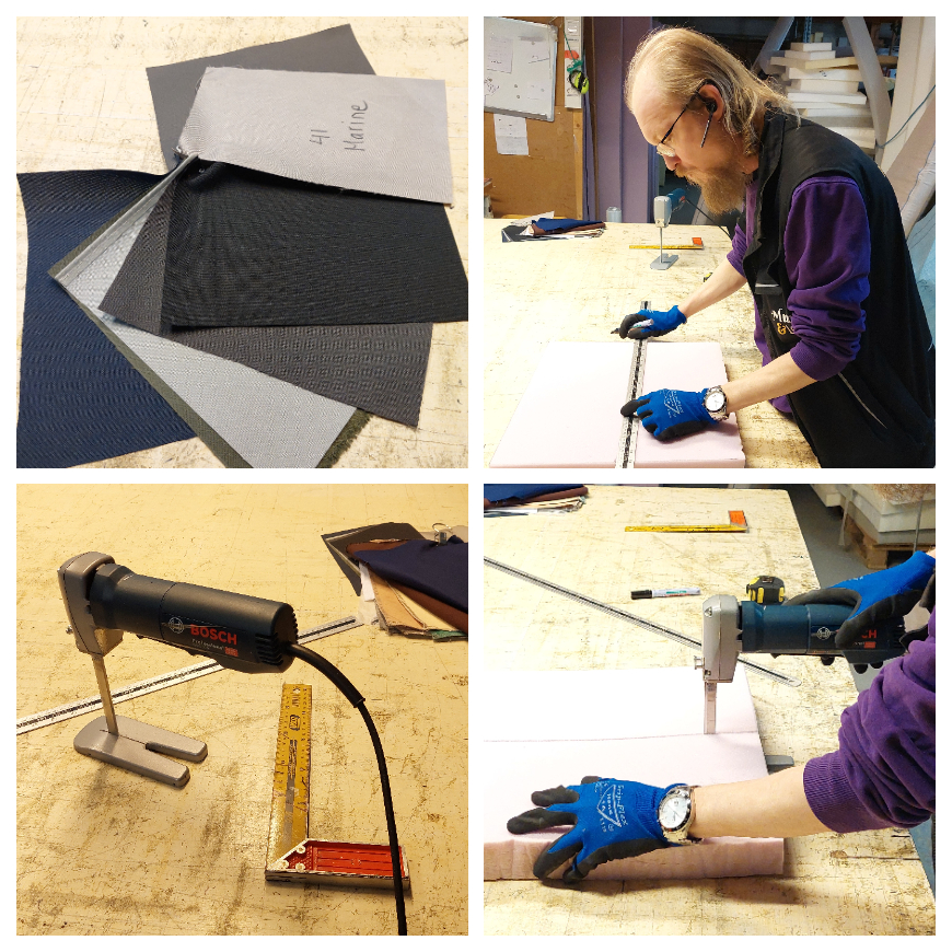 Kokenut, jo 10 vuotta talossa palvellut keravalainen Henri Tillonen eli Henkka leikkaa pääsääntöisesti vaahtomuovit asiakastilauksiin.