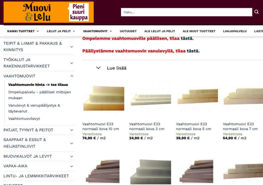 Pia muistuttaa, että Keravan Muovin ja Lelun vaahtomuovit ovat hyvälaatuisia ja kestävämpiä kuin monet kauppojen valmispatjat. Laadukkaan vaahtomuovin hinta on kallistunut maailmanmarkkinoilla viime vuosina. Muovin ja Lelun vaahtomuovi tulee Euroopasta.