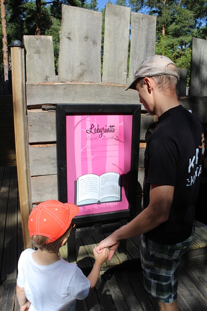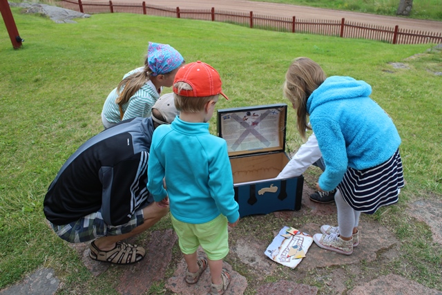Sisään astellessamme huomasimme äidin ja tyttären puuhastelevan jotakin linnan edustalla olevan pienen arkun luona. He vinkkasivat, että lapset voivat saada kassalta jännittävän aarteenetsintää muistuttavan tehtävän, jossa vaadittiin hyviä hoksottimia. Tehtävät olivat sekä suomeksi, ruotsiksi että englanniksi.