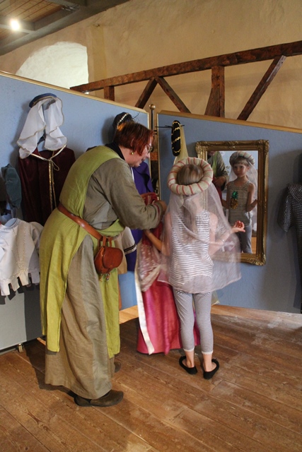 - Lasten huoneessa sai kokeilla keskiaikaisia asusteita museo-opas Annican avustamana.