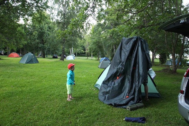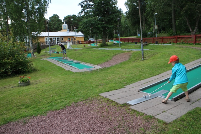 Aamulla, ennen seuraavaa määränpäätämme pelasimme kierroksen minigolfia. Lisäksi lapset testasivat leirintäalueen pomppulinnan sekä rannalla sijaitsevat leikkitelineet. Emme uskaltautuneet uimaan, sillä vesi oli vähän liian raikasta.