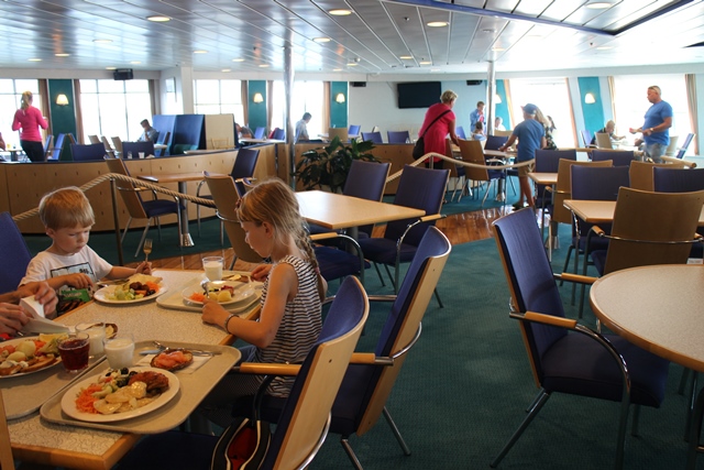 Matkan hintaan kuului buffet-ateria. Jos emme olisi olleet oma-aloitteisia ja kysyneet check-in –pisteellä ruokailun ajankohtaa, olisimme jääneet kokonaan ilman ruokaa. Tarkkaa ajankohtaa ei oltu ilmoitettu laivayhtiön nettisivuilla eikä matkalipussa. Vaikka levähdimme vain hetken hytissämme ennen ruokailua, aika meni niin tiukille, että hitaimmat jäivät kokonaan ilman jälkiruokaa. Muutoin ruoka oli todella hyvää ja se maistui myös lapsille.