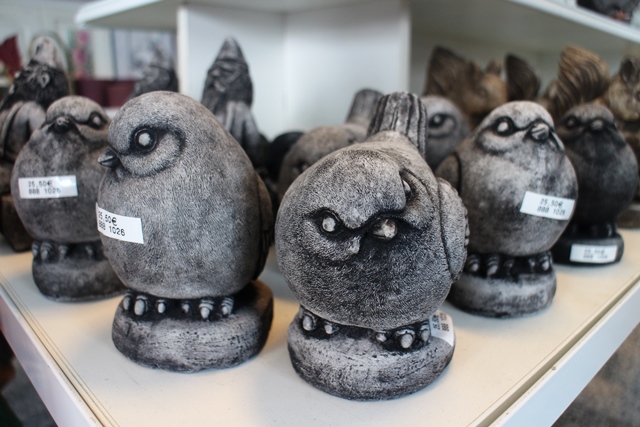 Kivapihalla riittää asiakkaita ympäri Suomen. Hiljattain asiakas tilasi graniittikarhun Lapin Karigasniemeltä asti. Valikoimassa on pihapatsaita Suomen lisäksi Virosta ja Puolasta. Virpi kertoo kotkapatsaiden olevan suosittuja, mutta meitä säväytti erityisesti hauskat ja värikkäät puutarhatontut.