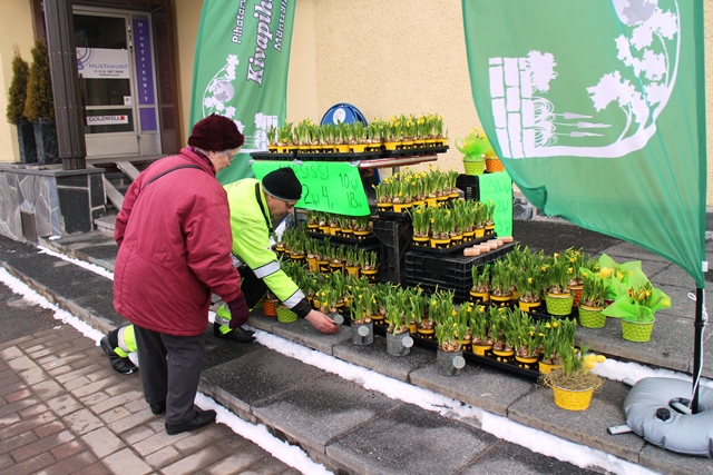 - Keväällä Hollannista tulevat tete-narsissit käyvät hyvin kaupaksi Mäntsälän keskustassa. Risto palvelee kukkaostoksille poikennutta Salli Immosta. Kuva: KivaaTekemistä.fi