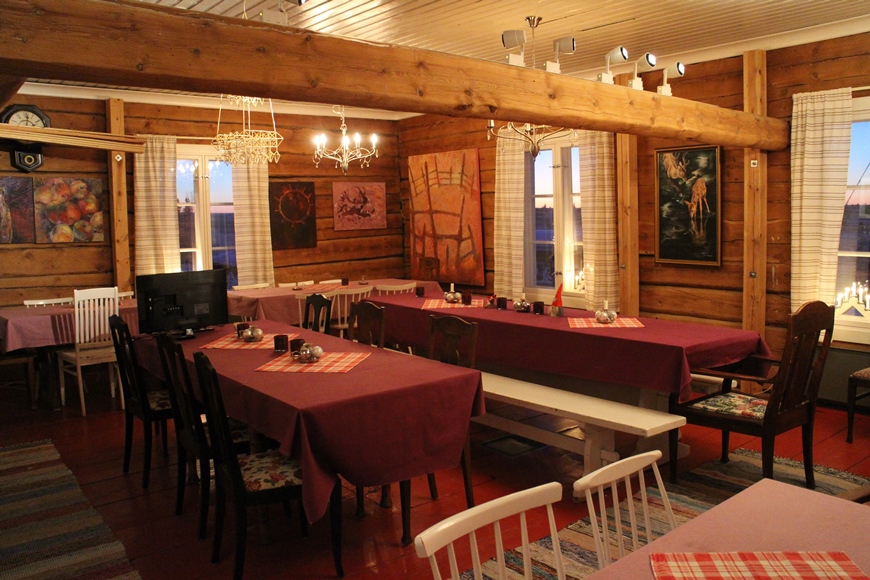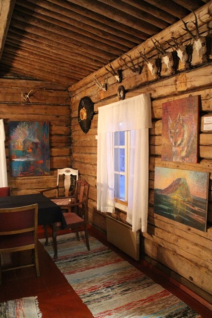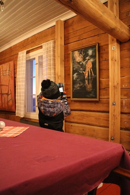 Hietalassa on Lapin mystiikasta ja perinteestä kertovia taideteoksia. Kuvassa vasemmalla Teijan upeita maalauksia. Eetu löysi suosikkitaulunsa Hietalan päärakennuksesta. Tekijä: Inari Raaterova. Kuvat: KivaaTekemistä.fi