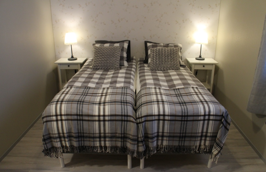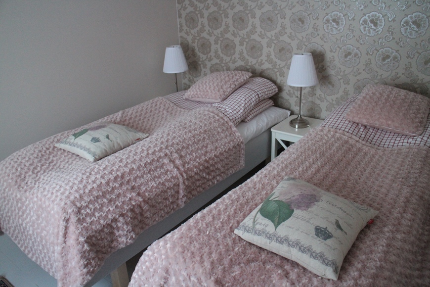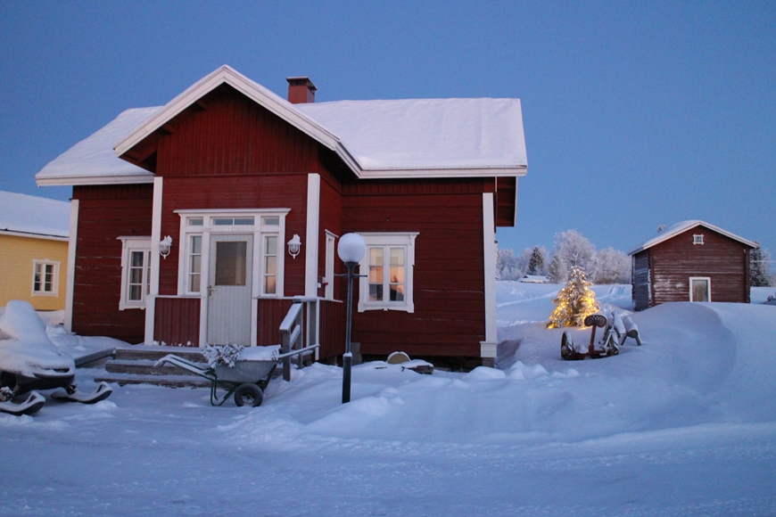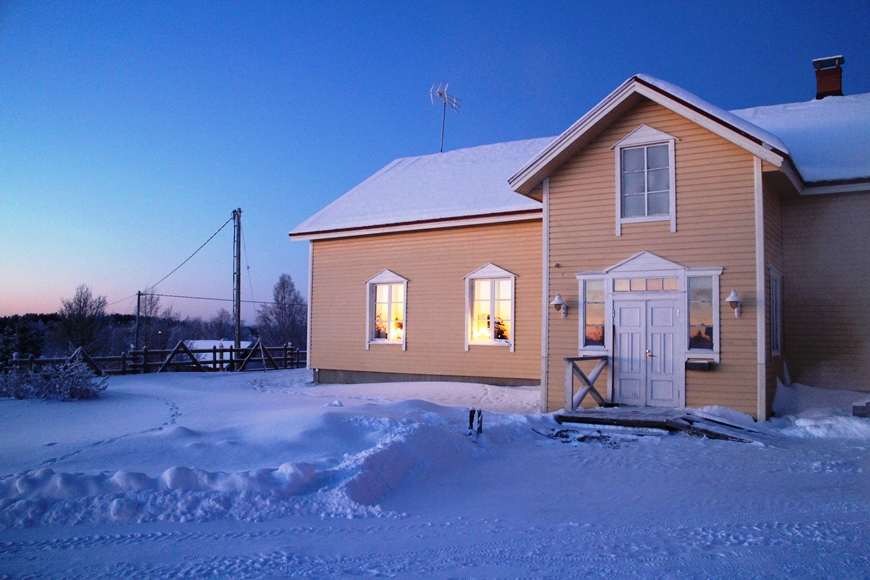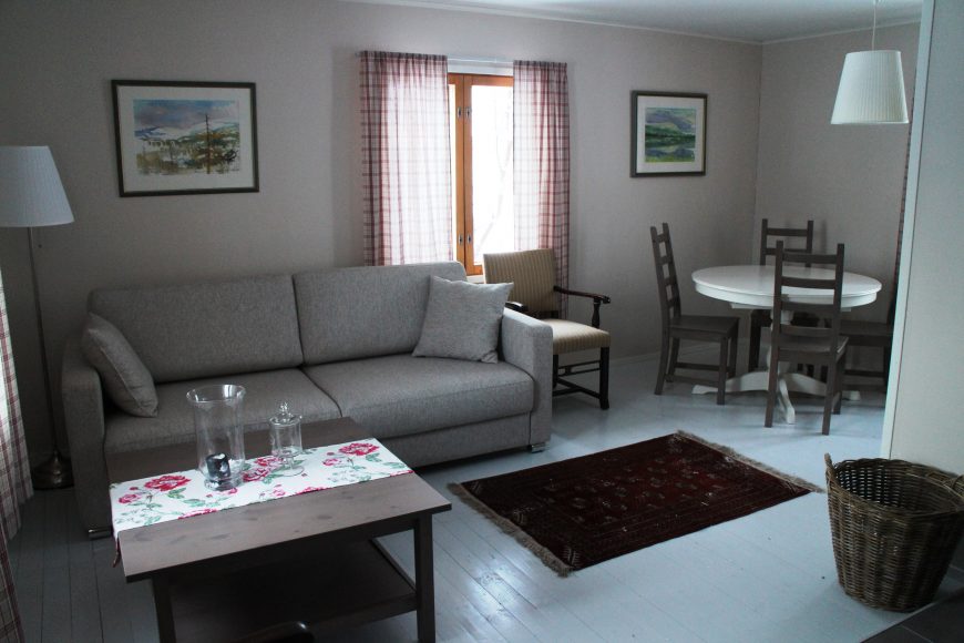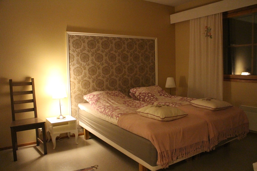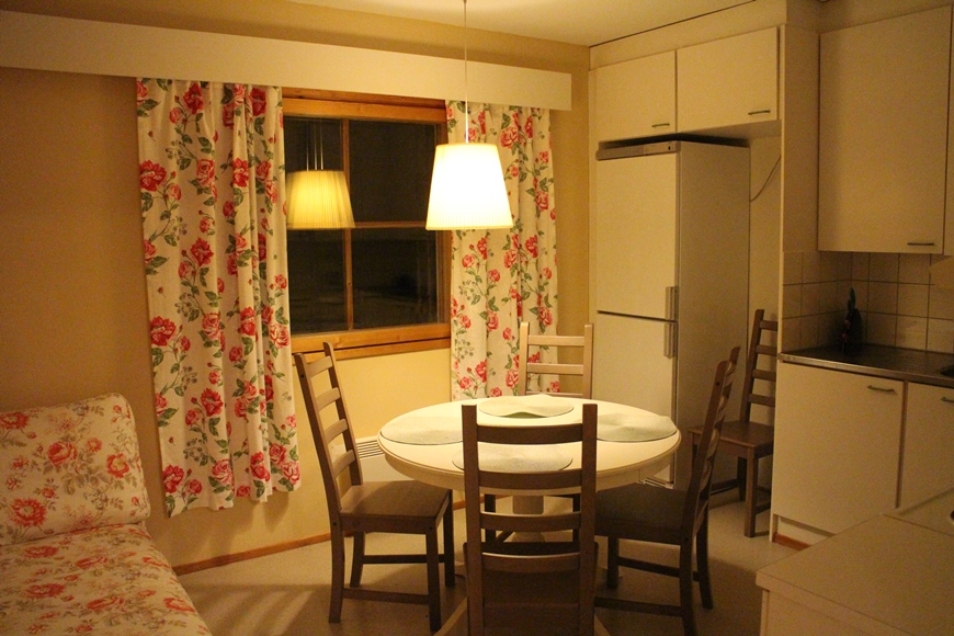 Kodikkaassa ja kauniisti sisustetussa huoneistossamme oli kaksi huonetta, keittiö ja sauna. Saimme näppärästi ostettua kaupalta ruuat iltaa ja aamupalaa varten. Jäätävistä -38 C pakkaslukemista huolimatta kävimme pienellä happihyppelyllä. Pakkanen ei tuntunut lapsia liiemmälti häiritsevän, sillä he olisivat halunneet jäädä vielä leikkimään huoneistojen edustalla oleville leikkitelineille.