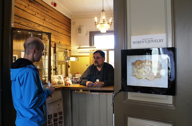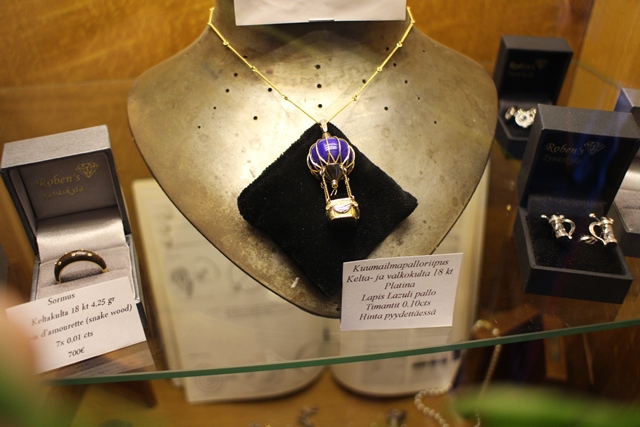 Ihastelin vitriinissä olevaa kuumailmapallo-kaulakorua. Kokemus ja intohimo todellakin näkyy Davidin töissä. David puhuu paremmin englantia, mutta ymmärtää ja palvelee myös supisuomalaisia asiakkaita.