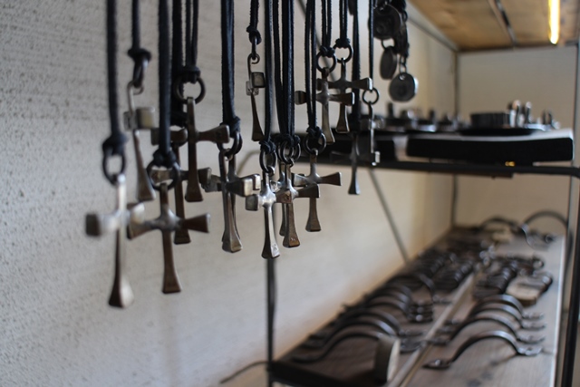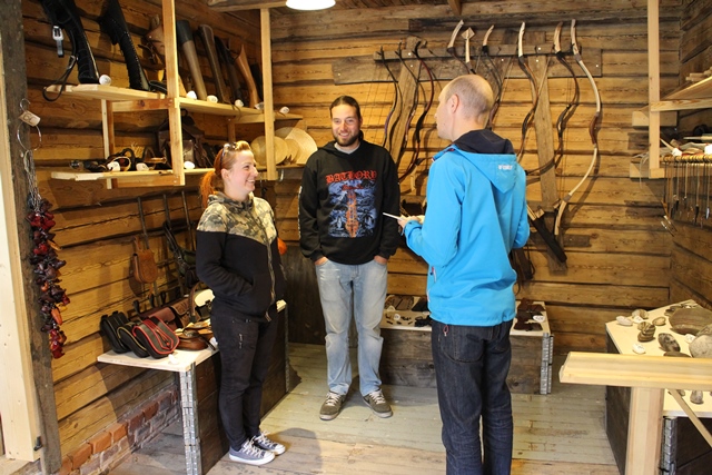 Pääsimme seuraamaan Markuksen työskentelyä myymälän yhteydessä olevalla sepänpajalla. Terva tuoksui, kun hän oli juuri pintakäsitellyt uittokeksin. Meille hän näytti, kuinka ruusu lämmitetään 1300 asteeseen ja sen jälkeen taotaan. Ruusu oli tietenkin rakenneterästä. Jos se jäähtyy liikaa, se murtuu takoessa. Ei muuta kun ruusu ahjon päälle uudestaan!