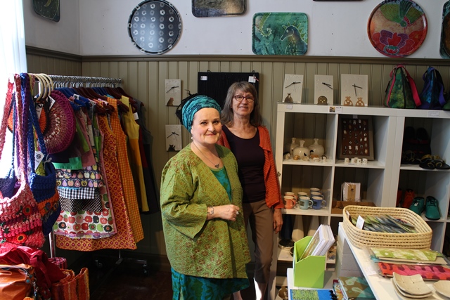 Huoneessa numero 6 tapasimme käsityöläisyrittäjä Sirpa Hasan ja Eila Remeksen. Sirpa suunnittelee ja valmistaa muun muassa batiikki-menetelmällä kankaita ja mekkoja Pukaran vanhalla koululla Konnevedellä. Sirpan tuotteet ovat värikkäitä tarjottimista mateennahkaisiin sandaaleihin.