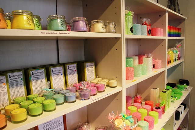 Artesaani Reeta Kuneliuksen värikkäitä ja uniikkeja kynttilöitä. Huone numero 5.