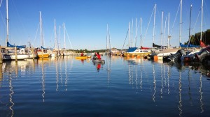 Kalastusta olisi voinut jatkaa kesäillassa vaikka kuinka pitkään mutta pimeys alkoi laskeutua ja oli palattava satamaan, koska kajakeissamme ei vielä ollut merkkivaloja. Näimme upean auringonlaskun, joutsenperheen lipuvan vedessä ja kuumailmapallojen taivaalla. Kalaa ei tullut mutta sillä ei oikeastaan ollut väliä ensikertalaisille.