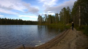 Seuraavana aamuna lähdimme kiertämään Salmijärven, mikä matkana on noin 3-4km riippuen reittivalinnasta. Koiramme nautiskeli vastaan tulleista luonnonpoukamista hiekkarantoineen täysin siemauksin ja juoksi ensimmäistä rantaa ehkä noin 20 kertaa edestakaisin hypellen puunrunkojen yli luonnon agility-rataa.