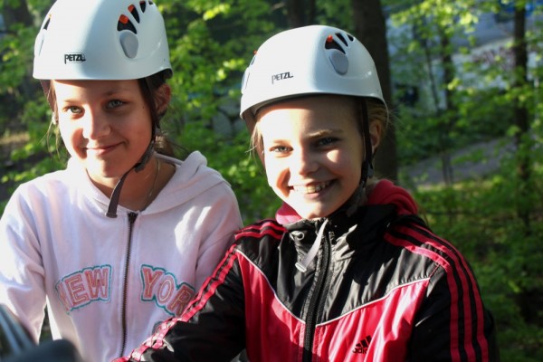 Seikkailijoita vastassa oli puiston toiminnastava vastaava Anna. Ensin tytöt varustettiin valjailla ja kypäröillä. Sitten heille kerrottiin, miten radoilla edetään. Seikkailupuistossa on käytössä ns. jatkuvavarmisteinen turvallisuusjärjestelmä, mikä tarkoittaa sitä, että seikkailija on koko radan ajan kytkettynä turvavaijeriin eikä pysty omatoimisesti siitä irroittautumaan.